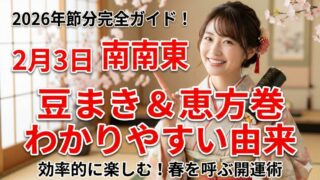 その他 節分2026年はいつ?恵方の方角「南南東」とわかりやすい由来・トレンド解説 2026年の節分は2月3日(火)、恵方は南南東!なぜ豆をまくの?子供向けのわかりやすい由来解説から、掃除が楽な「小袋豆まき」、恵方巻のルールまで。効率重視で楽しむ現代の節分ガイドです。 2026.01.25 その他